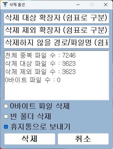 중복 파일을 검사한 후 삭제 버튼을 누르면 다음과 같은 삭제 옵션 창이 나타납니다: