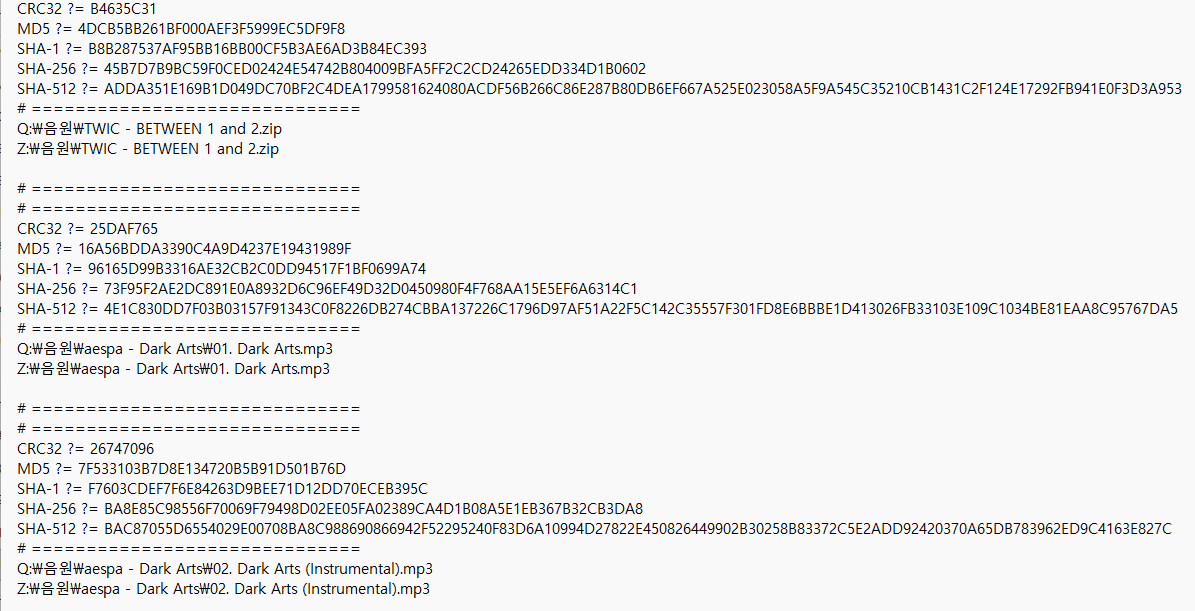 - 두 파일 해시값 비교: 서로 다른 두 파일의 해시값을 직접 비교해 완전히 동일한지 여부를 판별할 수 있습니다.